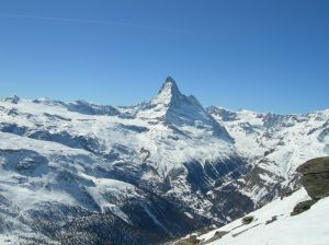 אדם ניצב מול נוף שוויצרי שכולל הרים, אגמים, כתובים בשוויצרית, וכן שאר הפרטים כולם בהתאמה לנוף שוויצרי בלבד מצד אחד, ומצד שני הוא רואה אורחת גמלים עוברת במקום זה.